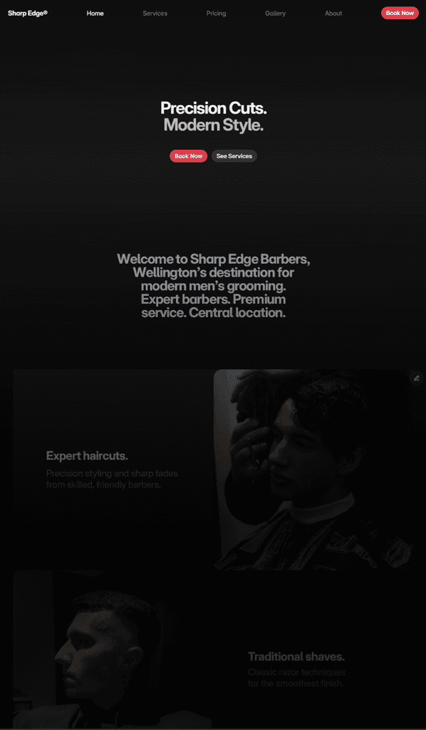 A modern barbershop website with bold typography and an appointment-focused layout. Features large visuals, streamlined booking, and an impactful homepage for immediate engagement.